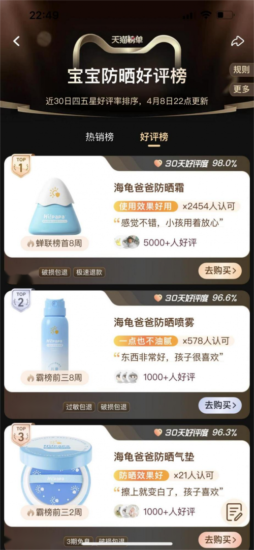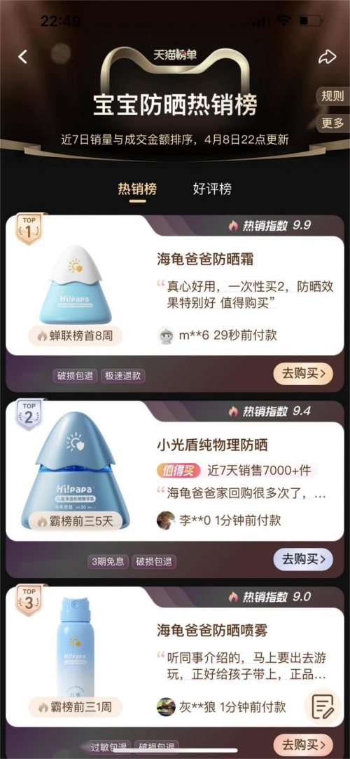 在代言人勢(shì)能的持續(xù)釋放與整合營(yíng)銷組合拳之下,目前,海龜爸爸旗下多款兒童防曬產(chǎn)品在市場(chǎng)上收獲了一眾好評(píng),在主流電商天貓平臺(tái)海龜爸爸仍以絕對(duì)的品類優(yōu)勢(shì)包攬了天貓寶寶防曬熱銷榜&好評(píng)榜前3名,銷量口碑依舊遙遙領(lǐng)先。