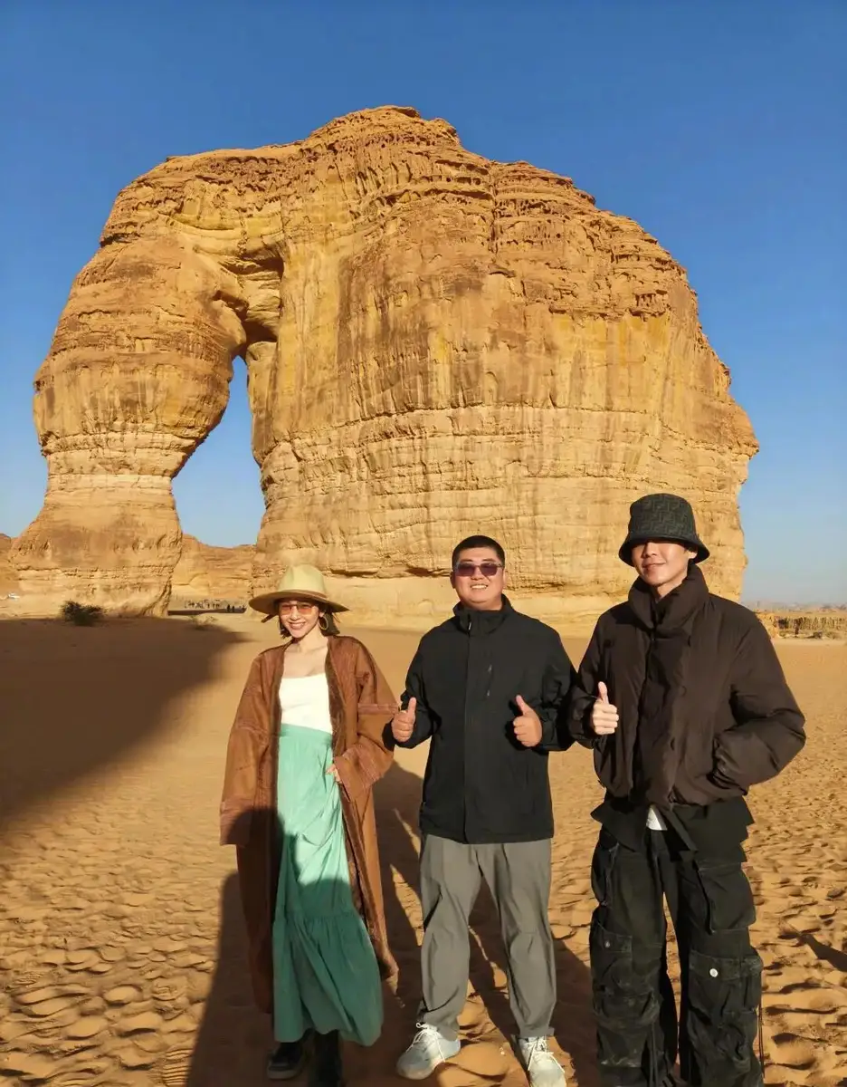 還有導游何老師也曬出與張若昀、唐藝昕夫婦的合照,并表示阿聯(lián)酋的冬天真是太適合旅游了,大家都玩得非常好。他還說:“兩位不僅低調(diào)親和,還充滿了旅行探索的精神,甜蜜互動讓我感受到滿滿的幸福!”