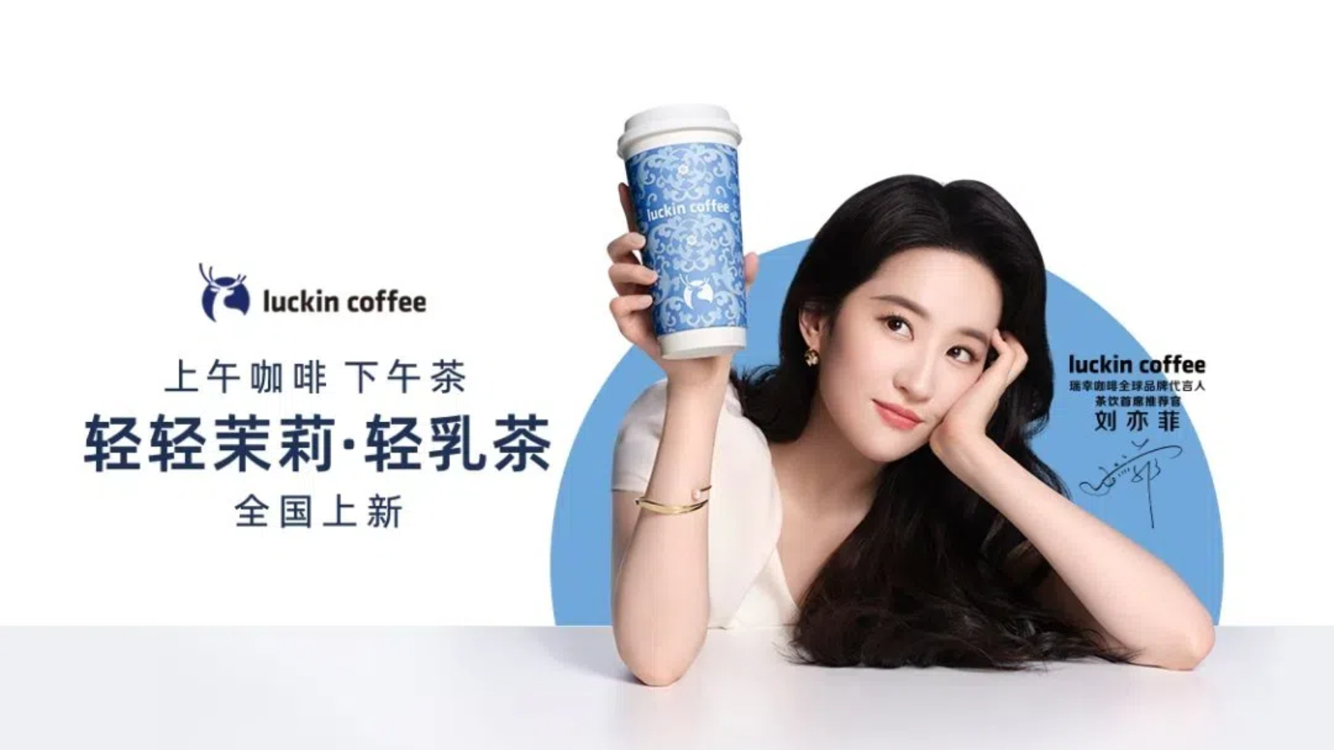 8 月 11 日,瑞幸咖啡正式官宣劉亦菲(明星代言公司)為全球品牌代言人及茶飲首席推薦官,同步推廣瑞幸首款輕茉莉 · 輕乳茶。
