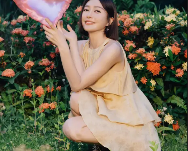 秦嵐穿嫩黃掛脖裙溫柔活潑 手拿愛(ài)心氣球笑容甜美