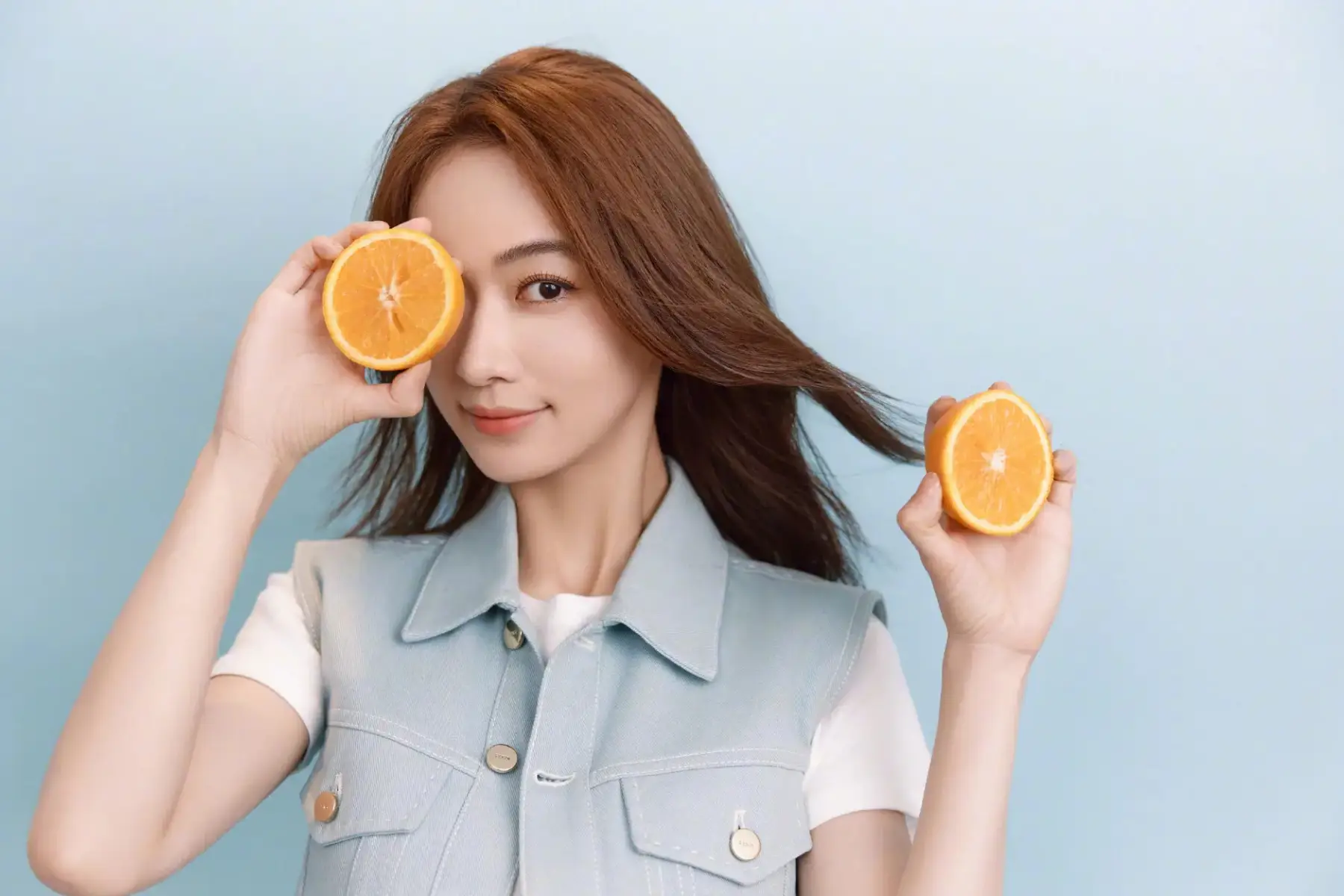 吳謹言身穿藍色馬甲清新可人 手拿橙子俏皮甜美