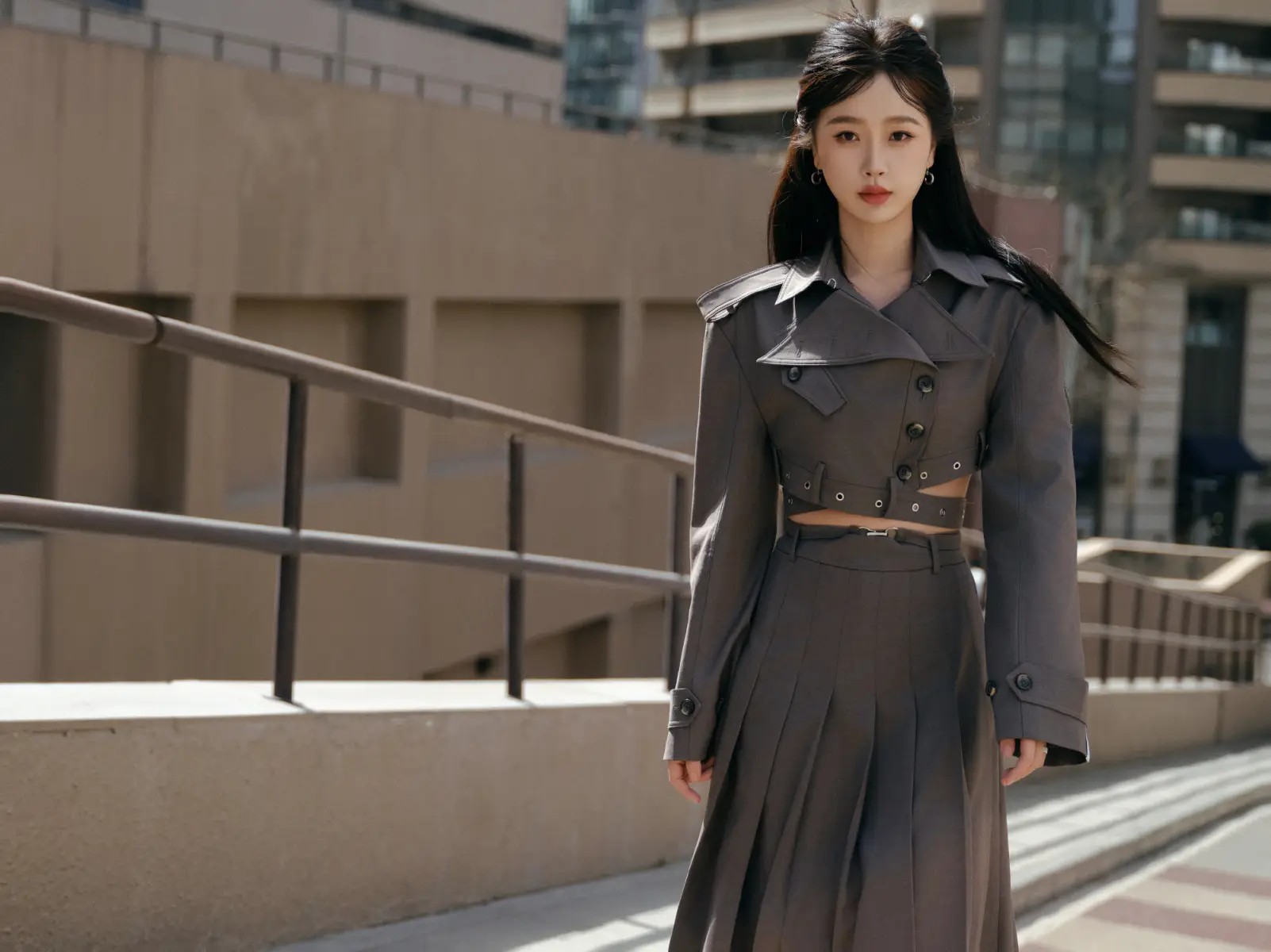 虞書欣穿灰色不規(guī)則裙細(xì)腰露出 半扎發(fā)瀟灑率性