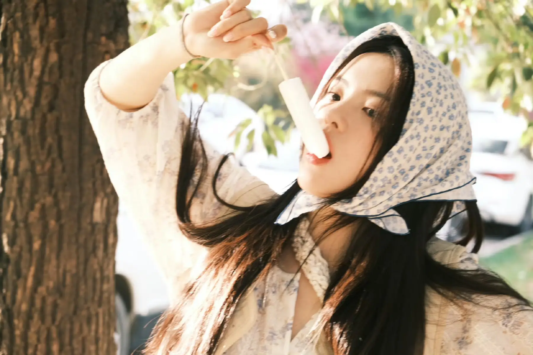 楊超越分享生活隨拍!戴頭巾吃雪糕元?dú)鉂M滿超可愛