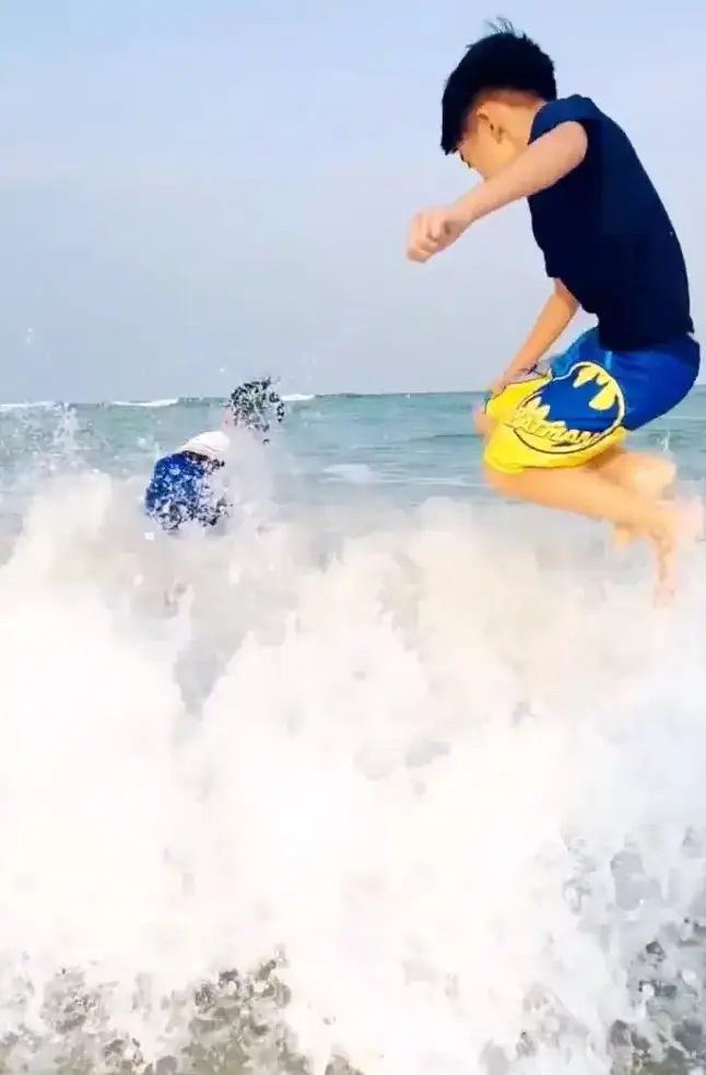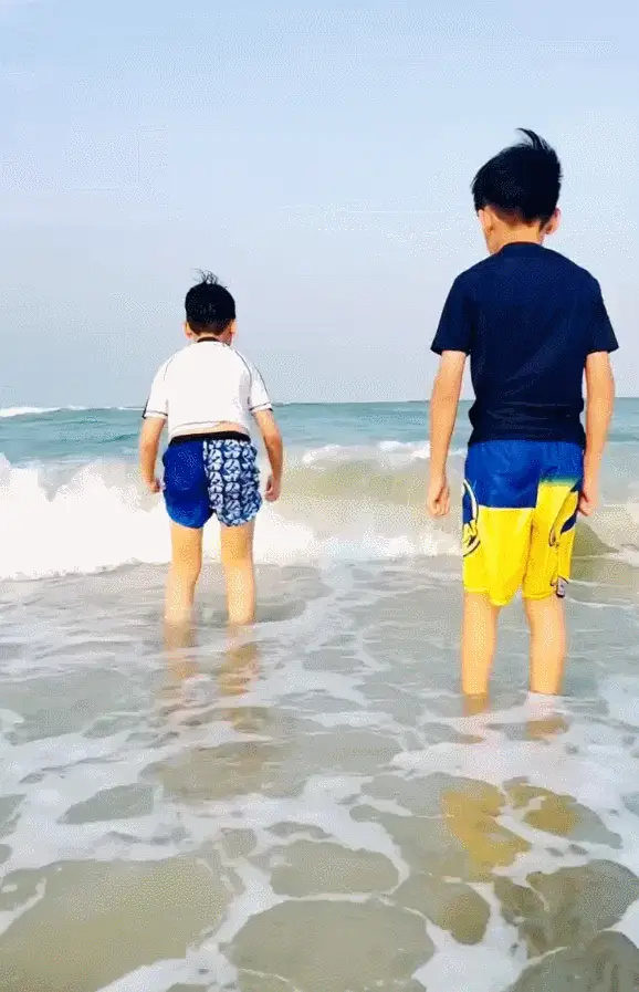 林志穎的雙胞胎兒子在海邊開心玩水。