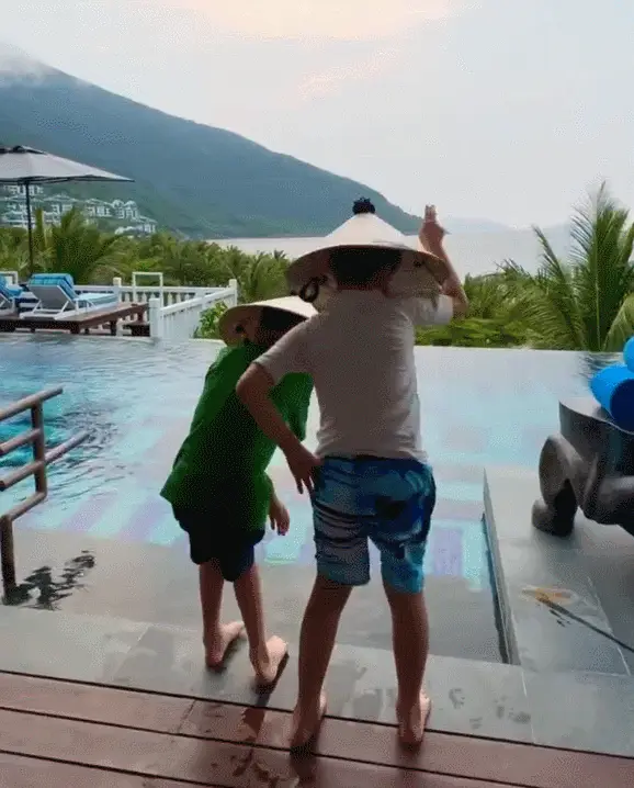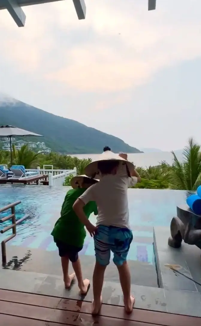 視頻中,除了林志穎出鏡,還有林志穎的兩個兒子也出鏡,兄弟倆個頭差不多、站在海邊興奮玩水,應該是林志穎的雙胞胎兒子Jenson和Kyson。