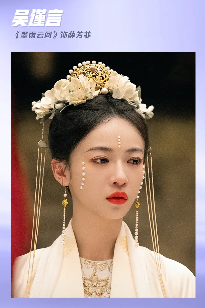 吳謹言在《墨雨云間》中飾演薛芳菲,這身梨花白的漢服,搭配著同色系的頭飾和珍珠花鈿,顯得尤為楚楚可憐!