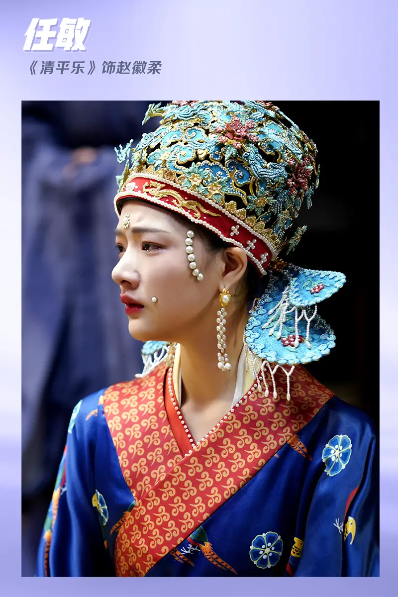 任敏在《清平樂》中飾演趙徽柔,臉部和耳飾上的珍珠顆粒飽滿圓潤,衣襟邊和鳳冠邊沿也都鑲嵌著碎珍珠,細節(jié)講究好漂亮!