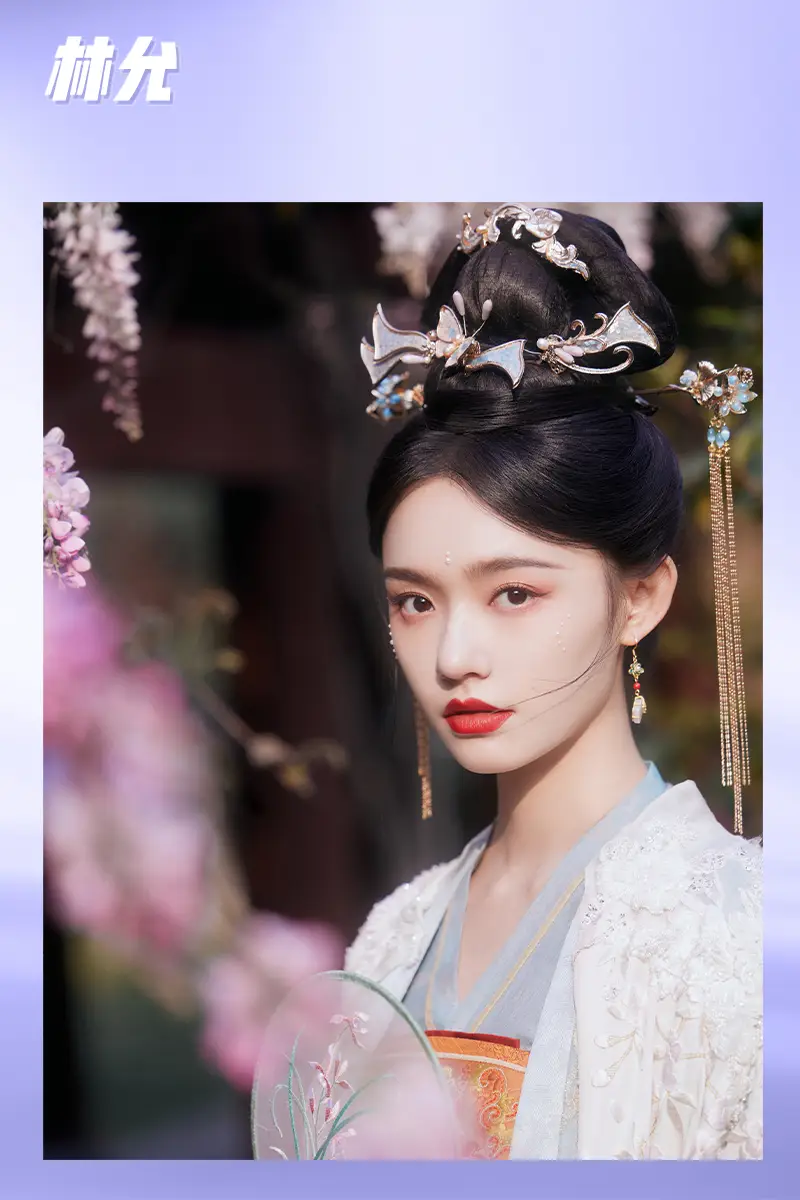 林允這套在開封拍的大宋國風片同樣采用了珍珠花鈿妝,但選用的珍珠都普遍較小,更有小家碧玉的感覺。