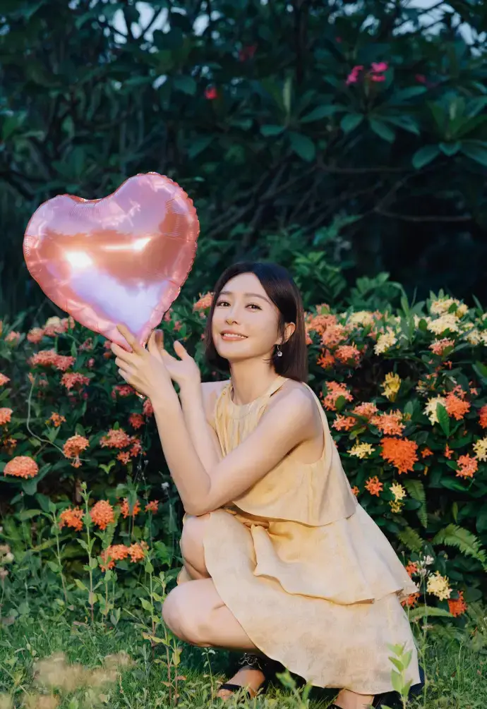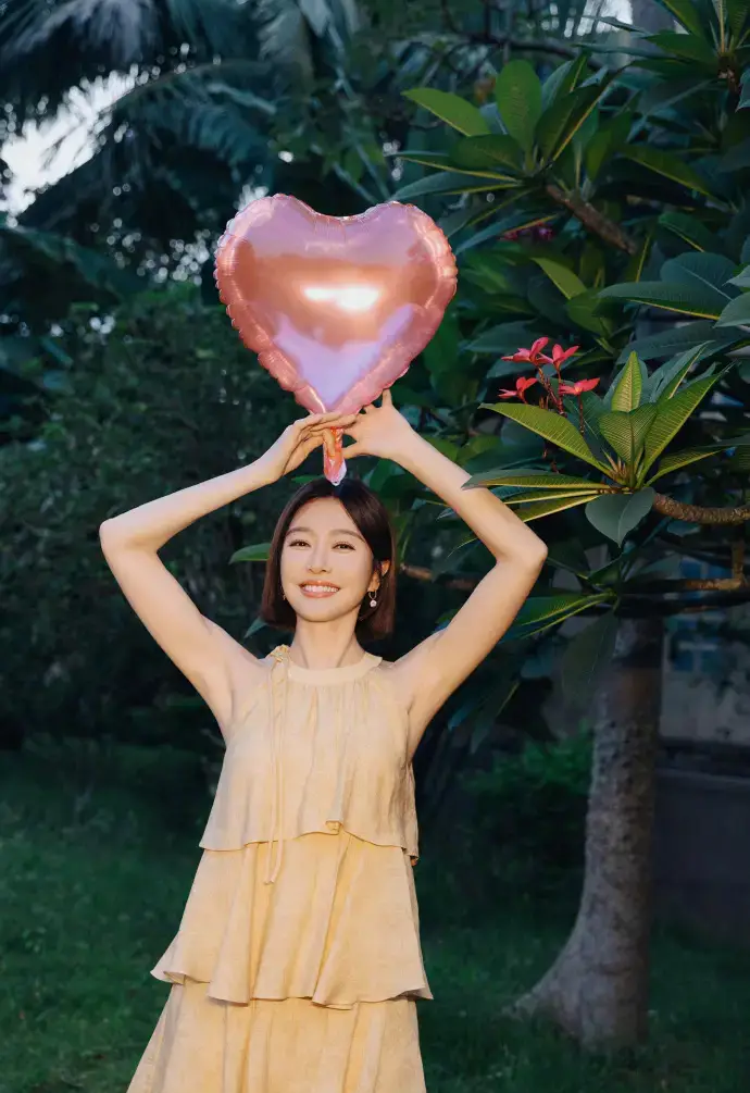 秦嵐穿嫩黃掛脖裙溫柔活潑 手拿愛心氣球笑容甜美