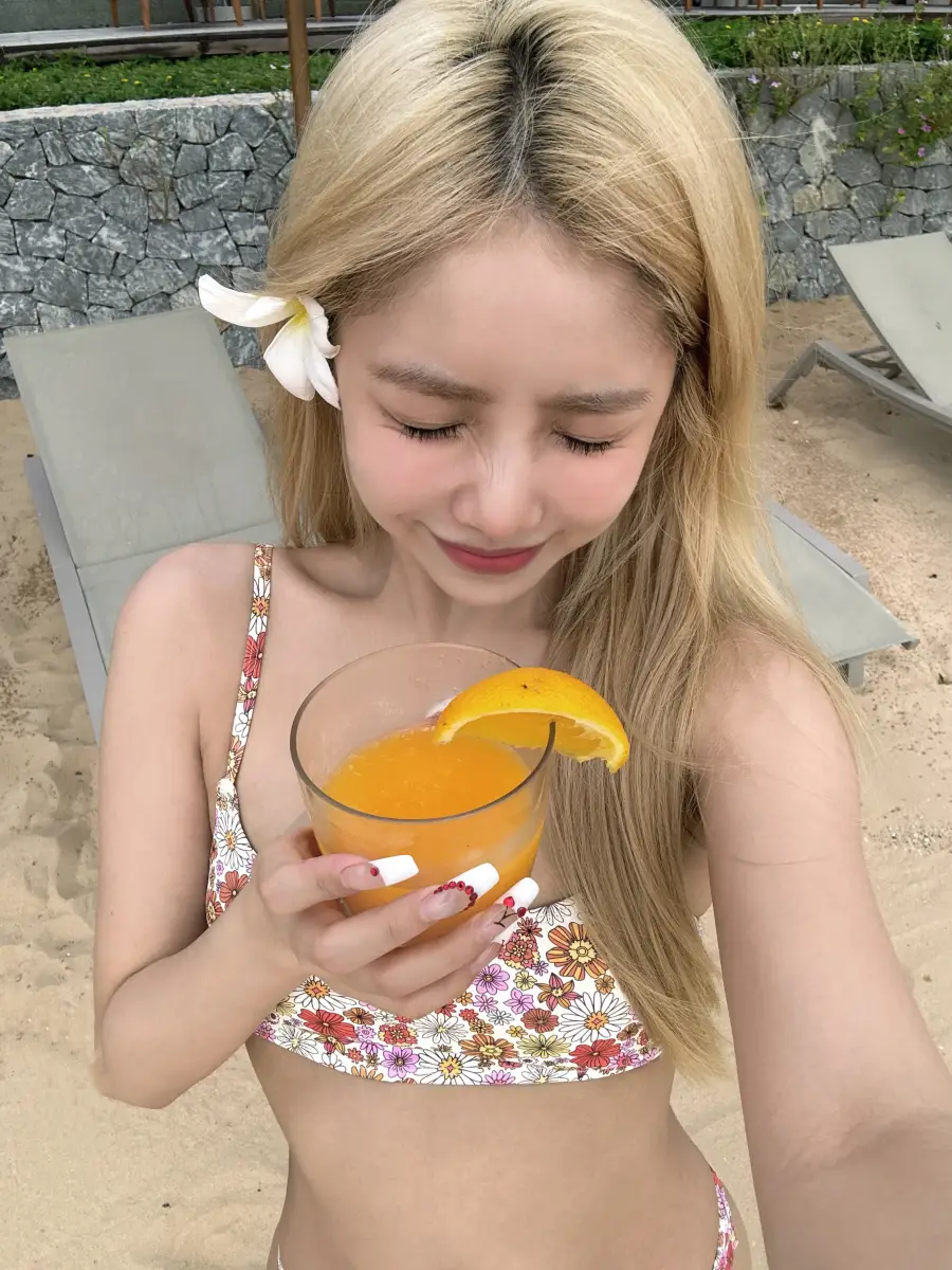 安崎手捧果汁,甜美似蜜桃。