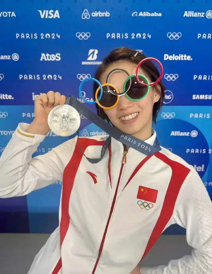 陳芋汐舉著獎(jiǎng)牌,擺出叉腰的姿勢(shì)非??蓯?ài)。