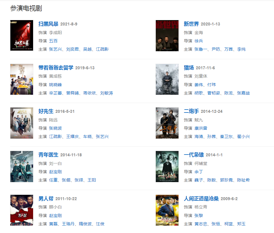代表作品:全民目擊、毒戰(zhàn)、征服、潛伏、人間正道是滄桑、好先生、帶著爸爸去留學、新世界、掃黑風暴