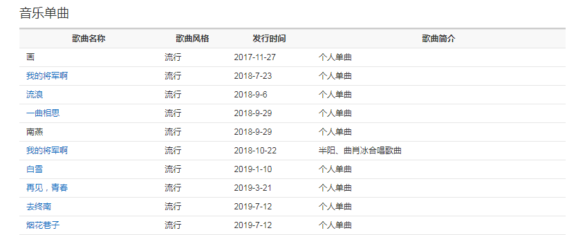 代表作品:一曲相思、流浪、我的將軍啊、賞花賞月賞秋香、注定孤獨(dú)終老、與山、此生過半