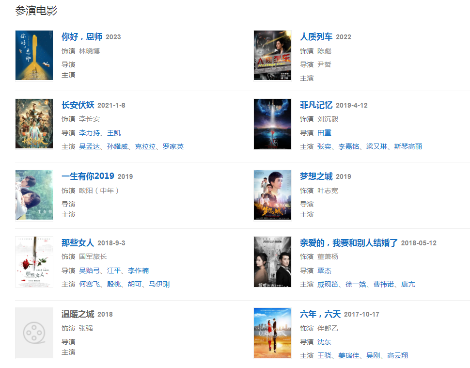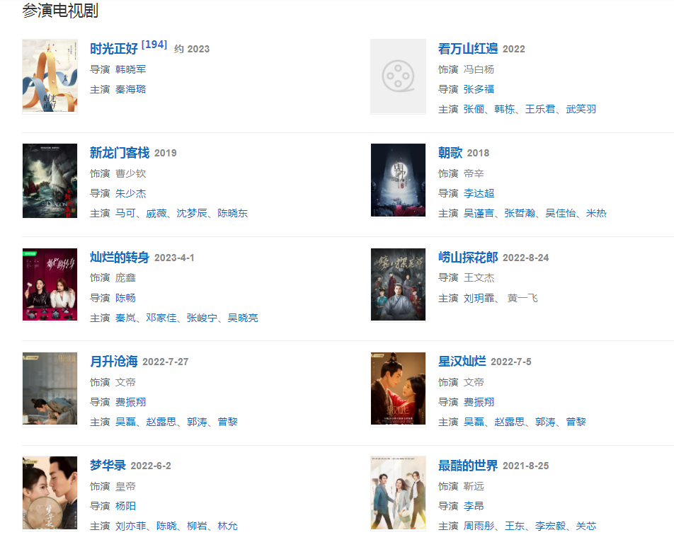 代表作品:十八歲的天空、又見一簾幽夢、薛仁貴傳奇、賢妻、至尊紅顏、秦王李世民、紅莓花兒開、在遠(yuǎn)方、華胥引之絕愛之城