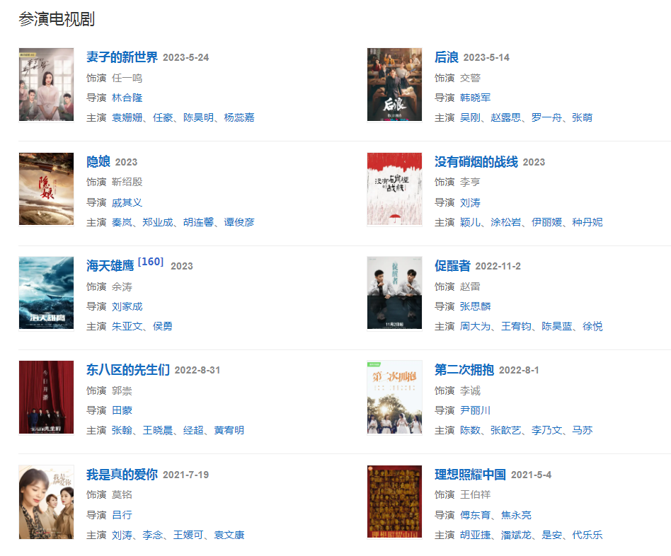 代表作品:敵營十八年、虎膽雄心、走西口、羅曼蒂克消亡史、八佰、北京青年、51號兵站、時空來電、青春期撞上更年期、女不強大天不容、維和步兵營