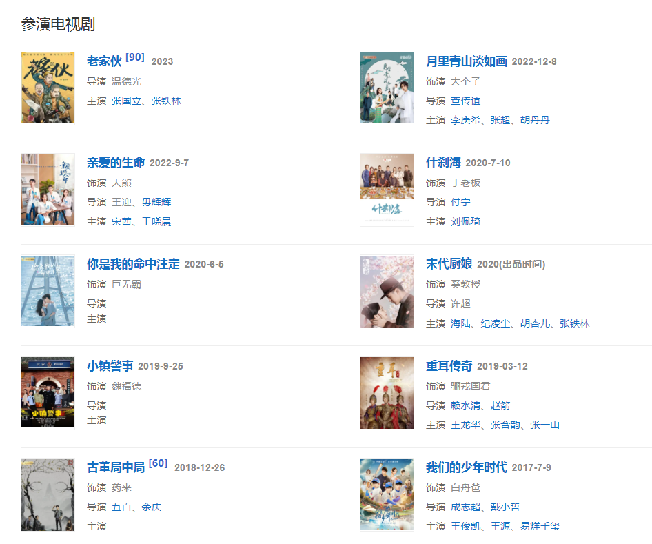 代表作品:夜幕下的哈爾濱、家宴、鐵齒銅牙紀(jì)曉嵐、江山風(fēng)雨情、夢斷紫禁城、鐵將軍阿貴、宰相劉羅鍋