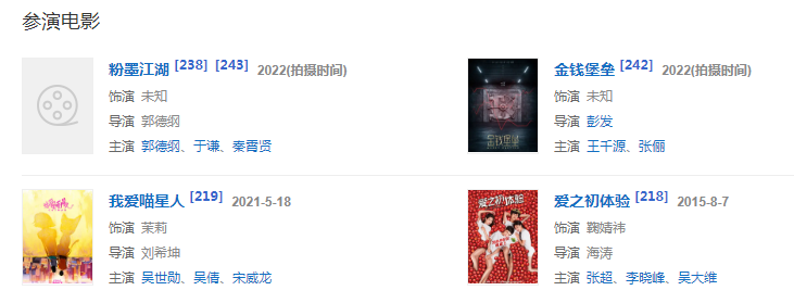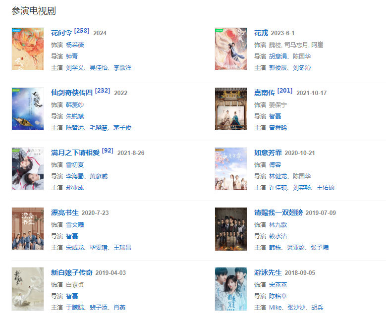 代表作品:蕓汐傳、新白娘子傳奇、請賜我一雙翅膀、如意芳霏、漂亮?xí)?、熱血長安、花戎