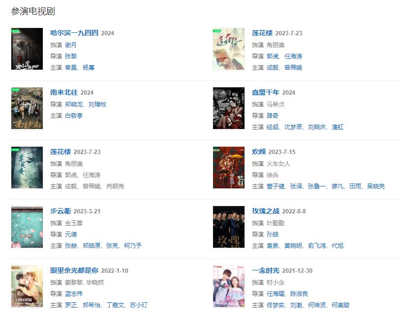代表作品:知否知否應(yīng)是綠肥紅瘦、長(zhǎng)安十二時(shí)辰、艷骨、金枝玉葉、扶搖、一念時(shí)光、哈爾濱一九四四 、蓮花樓