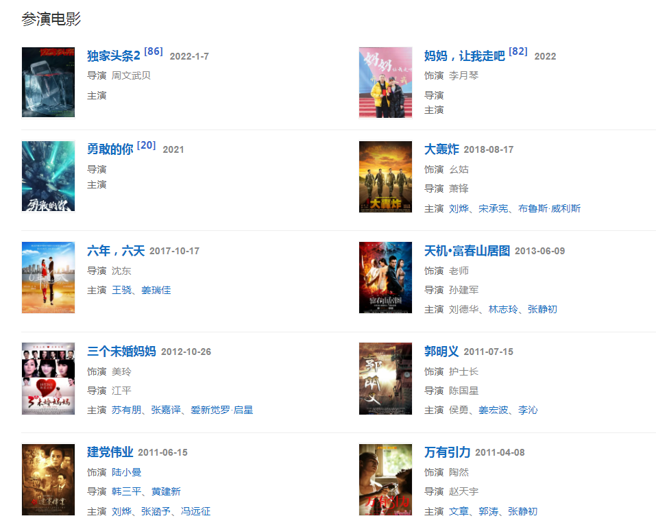代表作品:盤尼西林1944、愛情呼叫轉(zhuǎn)移、尋找劉三姐、三個未婚媽媽、工人大院、大轟炸