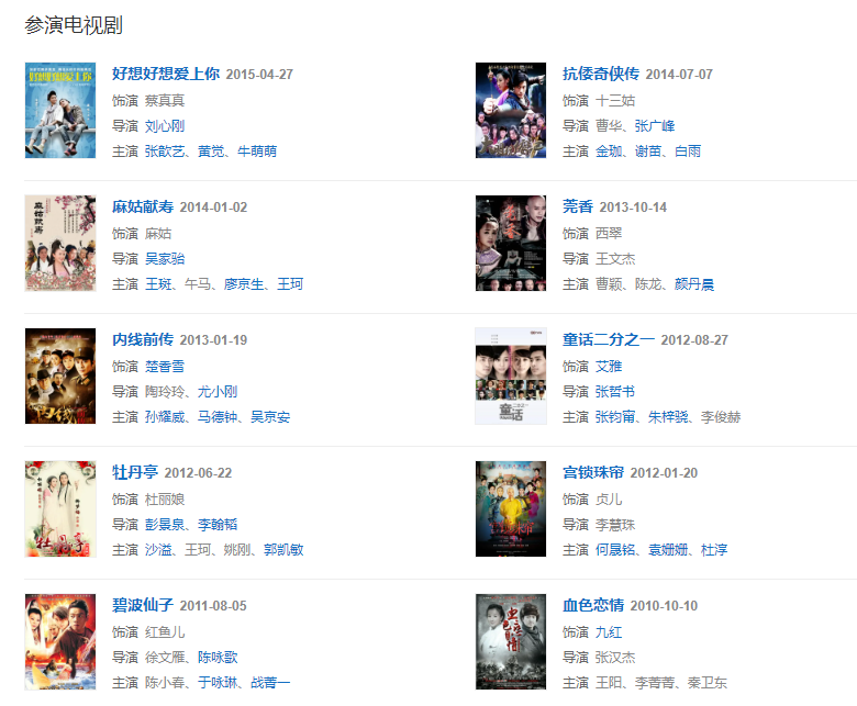 2003年在電視劇《萍蹤俠影》中扮演靜公主; 《李衛(wèi)當(dāng)官2》中扮演岳思盈;