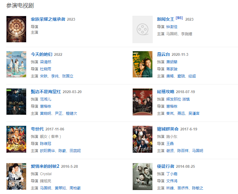 代表作品:宮心計、金枝欲孽、延禧攻略、公主嫁到、倚天屠龍記、使徒行者、天與地、鳳凰四重奏、帝女花、燕云臺
