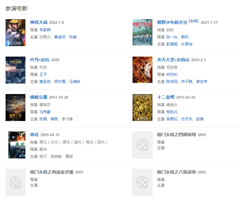 2001年,在古裝作品《楊門女將》中飾演女主角楊延琪。