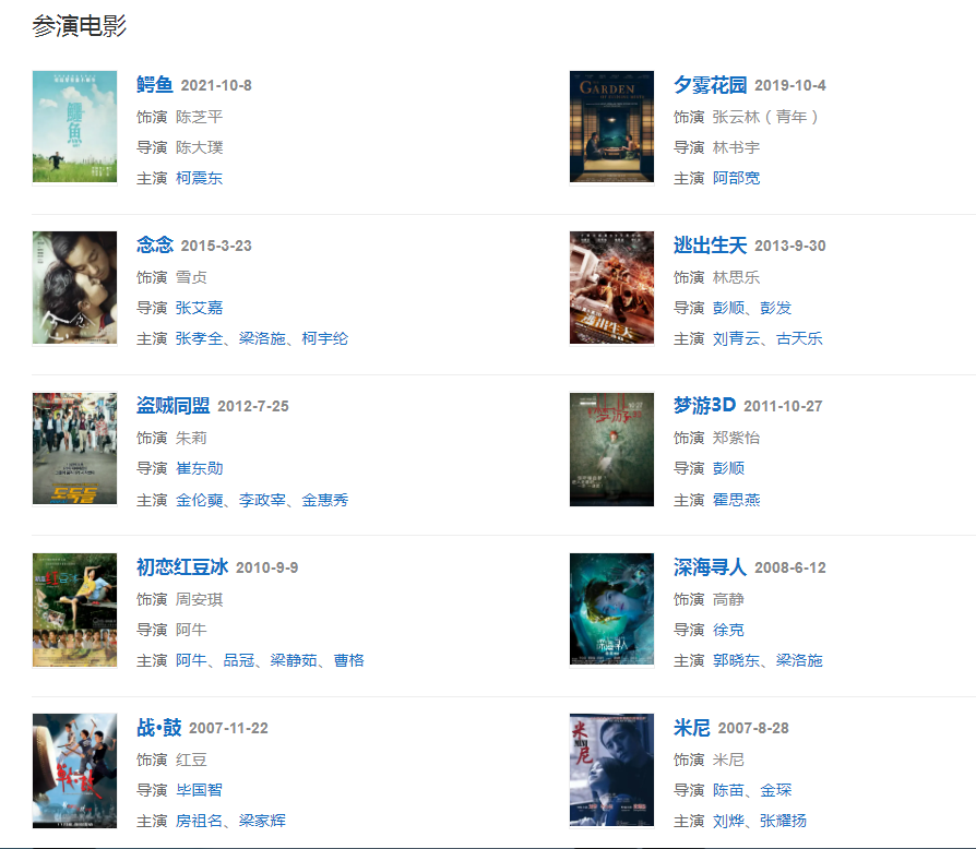 代表作品:陽光警察、愛你愛我、似水年華、深海尋人、見鬼、想飛、奪寶聯(lián)盟