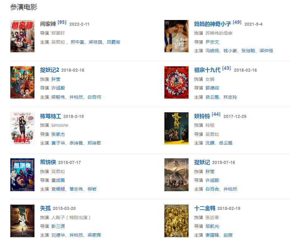 代表作品:我有我的溫柔、家有喜事、賭圣、四面夏娃、古惑仔情義篇之洪興十三妹、功夫足球、金雞、歲月神偷、妖鈴鈴
