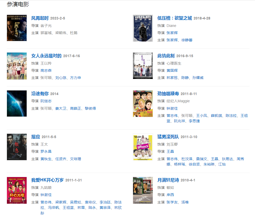 代表作品:九五至尊、難兄難弟、金枝欲孽、法證先鋒III、迷離檔案、地獄天使、女人最痛、來生不做香港人