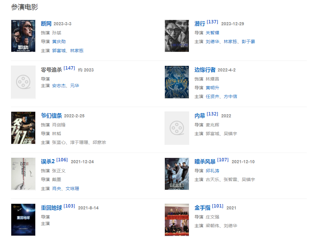 2023年3月29日,主演的電影《燈火闌珊》發(fā)布正式預(yù)告,4月13日在中國香港上映。4月2日,主演的電影《虎視眈眈》在長白山舉行開機(jī)儀式。5月15日,參演的電影《暗殺風(fēng)暴》官宣定檔8月18日上映,并發(fā)布預(yù)告。6月19日,參演的電影《潛行》正式定檔12月29日上映。6月29日,參加《2023灣區(qū)升明月大灣區(qū)電影音樂晚會》 在中國香港,為大灣區(qū)而歌。20:00將在全網(wǎng)主要媒體平臺同步播出。