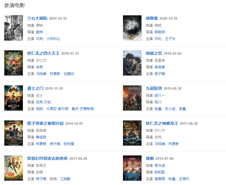 代表作品:艋舺、搜索、痞子英雄、南極之戀、三生三世十里桃花、狄仁杰之神都龍王、致我們終將逝去的青春、平凡的榮耀