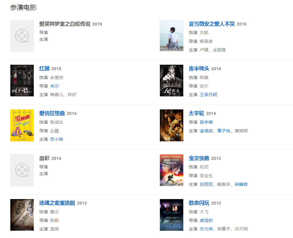 2013年,出演懸疑驚悚電影《女蛹之人皮嫁衣》;