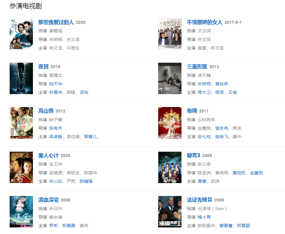 代表作品:《醫(yī)神華佗》、《皆大歡喜》、《布衣神相》、《法證先鋒》